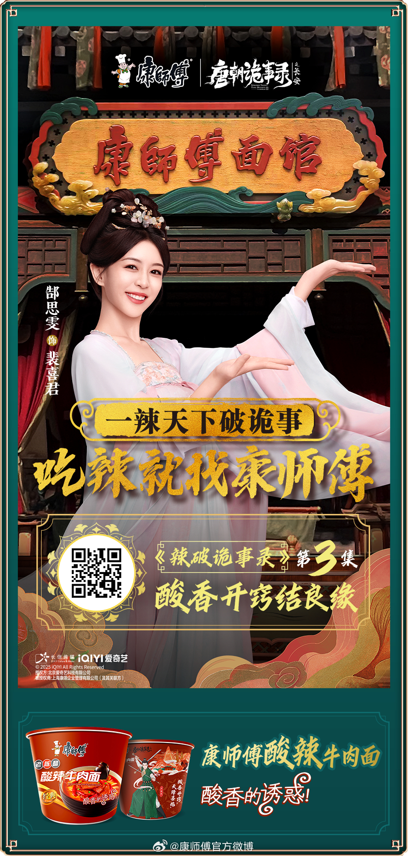 Master Kong has teamed up with "The Strange Tales of Tang Dynasty 3" for a deep collaboration, launching a single-episode customized short drama titled "Spicy Breakthrough of the Strange Tales". Starring the original cast, it will be updated daily from November 18th to 24th. The plot integrates Master Kong's noodle shop into the Tang Dynasty setting, with seven spicy instant noodles serving as "external equipment" for solving cases - for instance, the Spicy Beef Noodle inspires detective work (in the first episode), and the Sour and Spicy Beef Noodle transforms into a "wedding noodle" to witness the romance of characters (in the third episode).