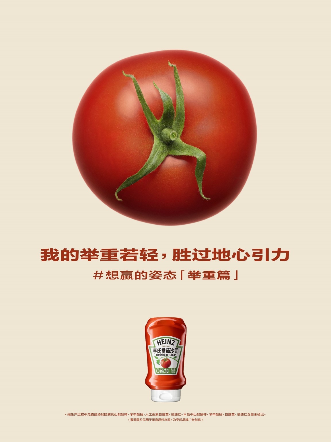 亨氏携手上海创意机构 Heaven & Hell ,将其标志性番茄化身 34 个运动形象,每个形象代表一项不同的赛事,从篮球到艺术体操。这一创意理念旨在将亨氏番茄背后的精准与用心与运动员的专注精神相联系。应该是考虑到本届全运会在大湾区举行,每一幅广告都采用了普通话与粤语两种版本。